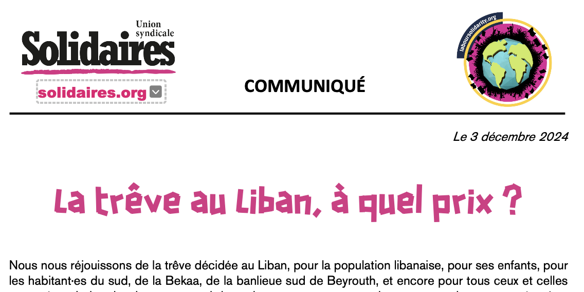 Nous nous réjouissons de la trêve décidée au Liban, pour la population libanaise, pour ses enfants, pour les habitant·es du sud, de la Bekaa, de la banlieue sud de Beyrouth, et encore pour tous ceux et celles menacé·es de bombardements car abritant des personnes venant de ces zones donc supposées être membres ou sous influence du Hezbollah. Israël n’aura pas réussi à entraîner le Liban dans un conflit confessionnel mais aura causé des milliers de mort·es, de blessé·es, des déplacé·es de plus d’un million, des infrastructures détruites dans un pays déjà à genoux.