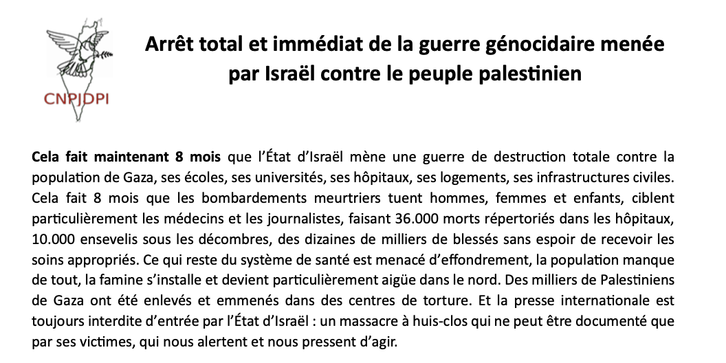 Arrêt total et immédiat de la guerre génocidaire menée par Israël contre le peuple palestinien