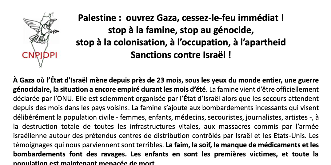 À Gaza où l’État d’Israël mène depuis près de 23 mois, sous les yeux du monde entier, une guerre génocidaire, la situation a encore empiré durant les mois d’été. La famine vient d’être officiellement déclarée par l’ONU. Elle est sciemment organisée par l’État d’Israël alors que les secours attendent depuis des mois dans les pays voisins. La famine s’ajoute aux bombardements incessants qui visent délibérément la population civile - femmes, enfants, médecins, secouristes, journalistes, artistes -, à la destruction totale de toutes les infrastructures vitales, aux massacres commis par l’armée israélienne autour des prétendus centres de distribution contrôlés par Israël et les Etats-Unis. Les témoignages qui nous parviennent sont terribles. La faim, la soif, le manque de médicaments et les bombardements font des ravages. Les enfants en sont les premières victimes, et toute la population est maintenant menacée de mort.