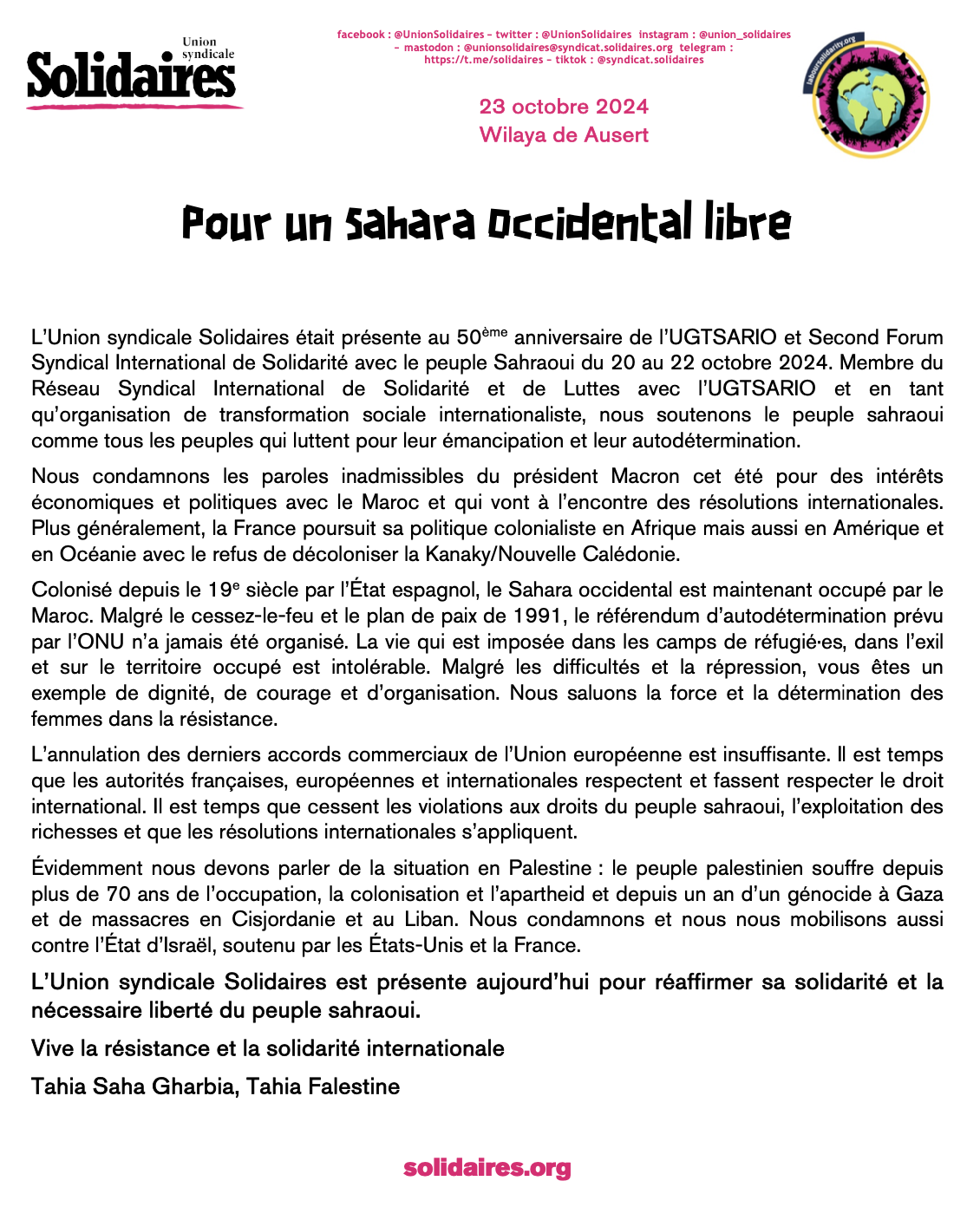 L’Union syndicale Solidaires était présente au 50ème anniversaire de l’UGTSARIO et Second Forum Syndical International de Solidarité avec le peuple Sahraoui du 20 au 22 octobre 2024. Membre du Réseau Syndical International de Solidarité et de Luttes avec l’UGTSARIO et en tant qu’organisation de transformation sociale internationaliste, nous soutenons le peuple sahraoui comme tous les peuples qui luttent pour leur émancipation et leur autodétermination.