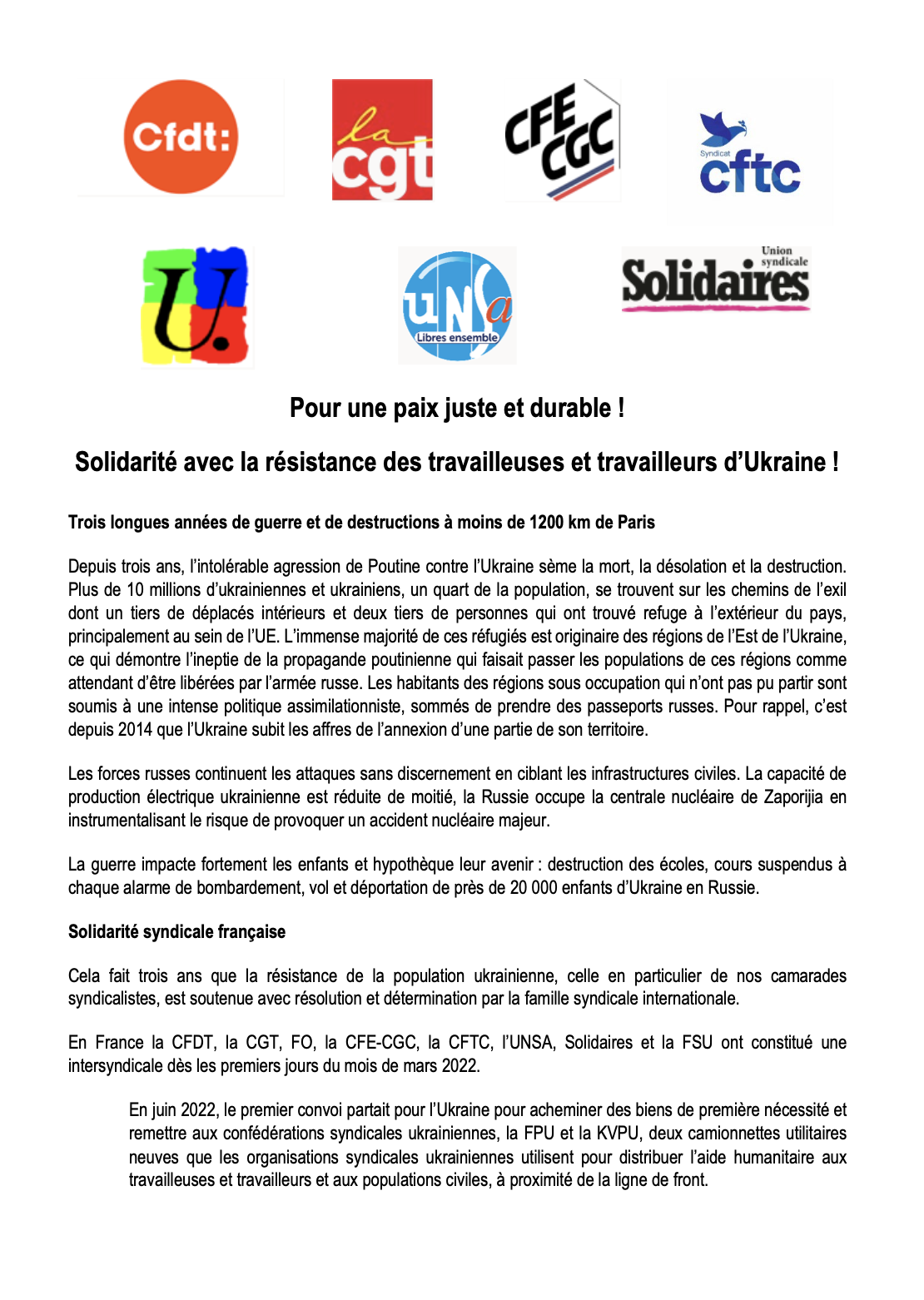 L’intersyndicale française de solidarité avec l’Ukraine appelle à participer aux initiatives unitaires organisées en France, notamment à la marche pour l’Ukraine, le dimanche 23 février 2025 à Paris au départ de la place de la