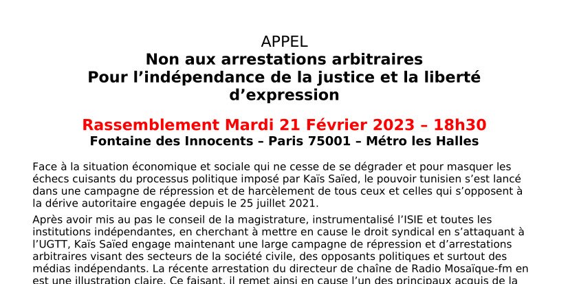 Face à la situation économique et sociale qui ne cesse de se dégrader et pour masquer les échecs cuisants du processus politique imposé par Kaïs Saïed, le pouvoir tunisien s’est lancé dans une campagne de répression et de harcèlement de tous ceux et celles qui s’opposent à la dérive autoritaire engagée depuis le 25 juillet 2021.
