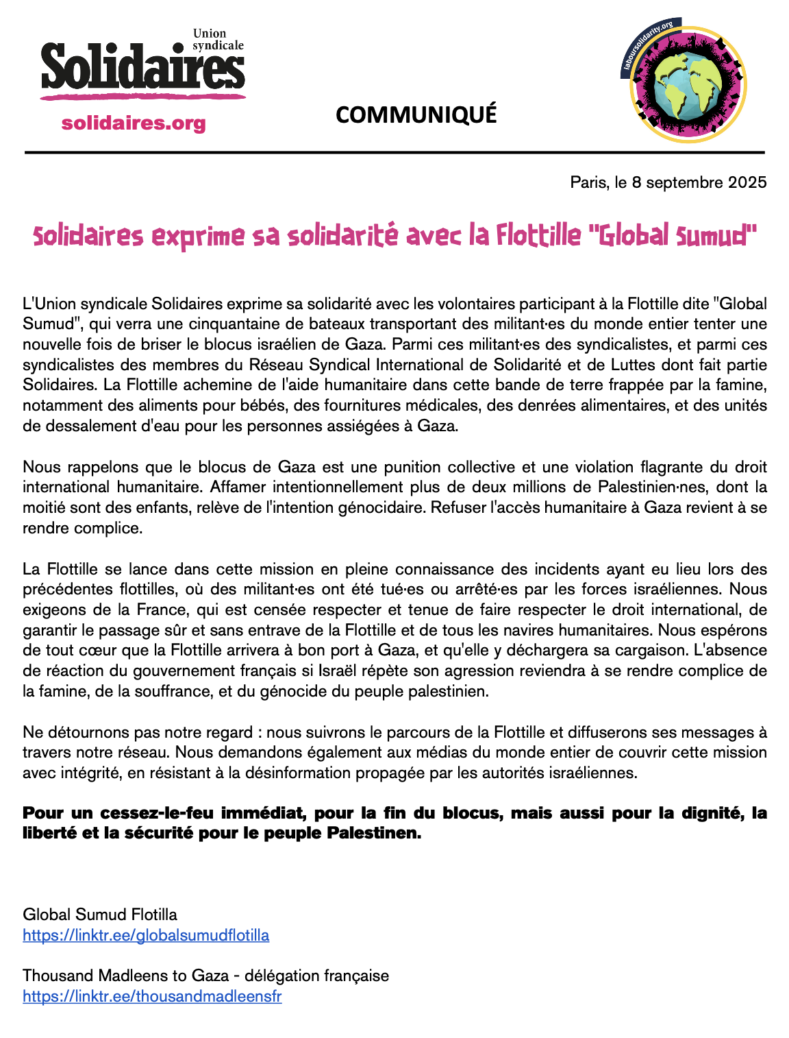 L'Union syndicale Solidaires exprime sa solidarité avec les volontaires participant à la Flottille dite "Global Sumud", qui verra une cinquantaine de bateaux transportant des militant·es du monde entier tenter une nouvelle fois de briser le blocus israélien de Gaza. Parmi ces militant·es des syndicalistes, et parmi ces syndicalistes des membres du Réseau Syndical International de Solidarité et de Luttes dont fait partie Solidaires. La Flottille achemine de l'aide humanitaire dans cette bande de terre frappée par la famine, notamment des aliments pour bébés, des fournitures médicales, des denrées alimentaires, et des unités de dessalement d'eau pour les personnes assiégées à Gaza.