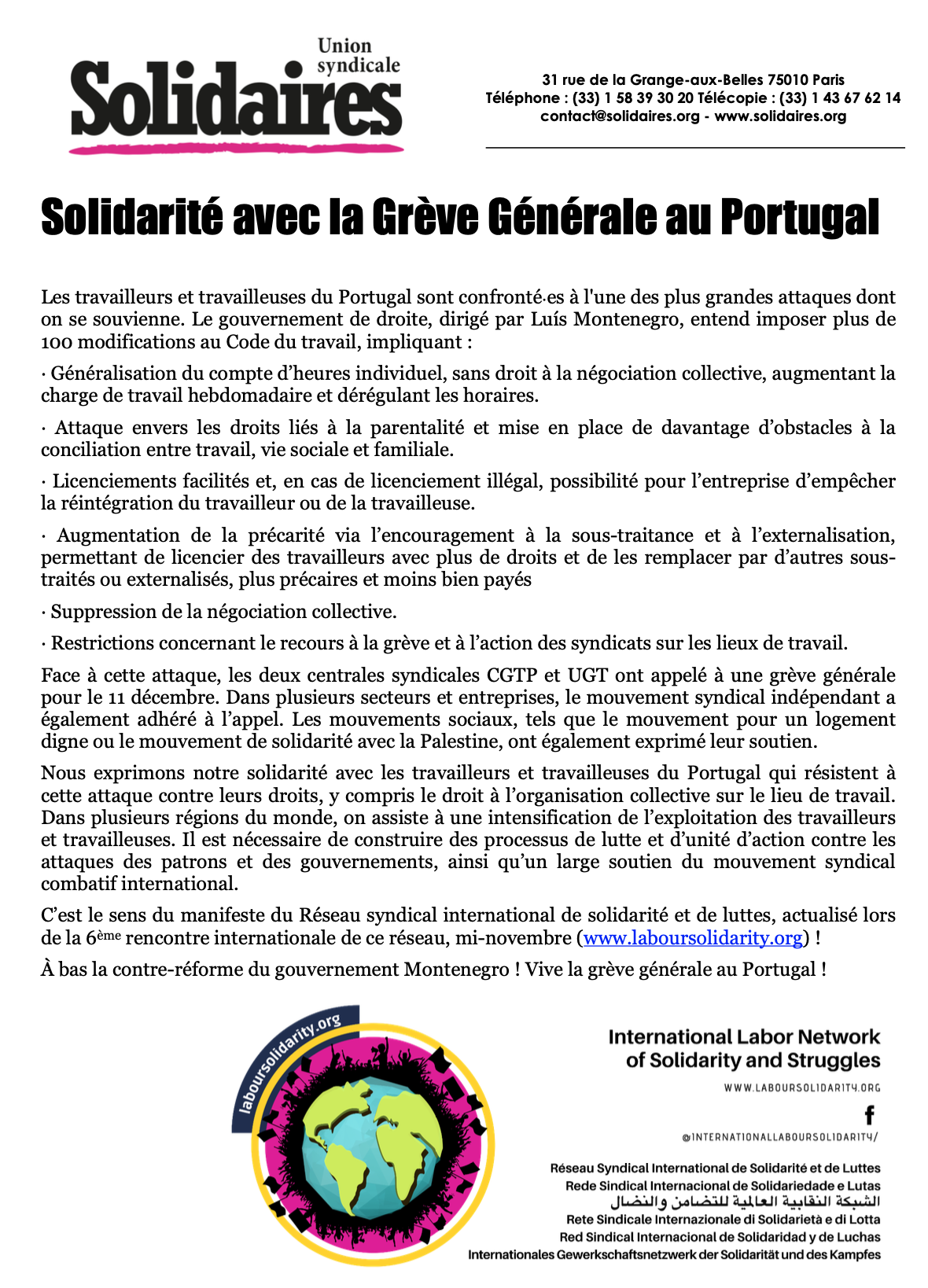 Nous exprimons notre solidarité avec les travailleurs et travailleuses du Portugal qui résistent à cette attaque contre leurs droits, y compris le droit à l’organisation collective sur le lieu de travail.