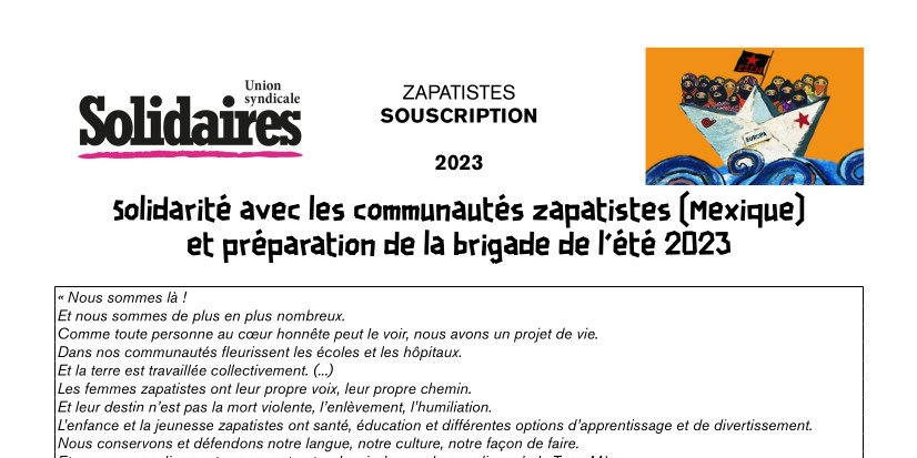 Nous proposons une souscription pour soutenir la formation en territoire zapatiste (après l’eau et la clinique des femmes). L’argent sera remis cet été au Conseil de Résistance et de Rébellion Zapatiste en charge des relations extérieures. Nous appelons les syndicats, les fédérations, les Solidaires locaux et les adhérent-es à y participer.
