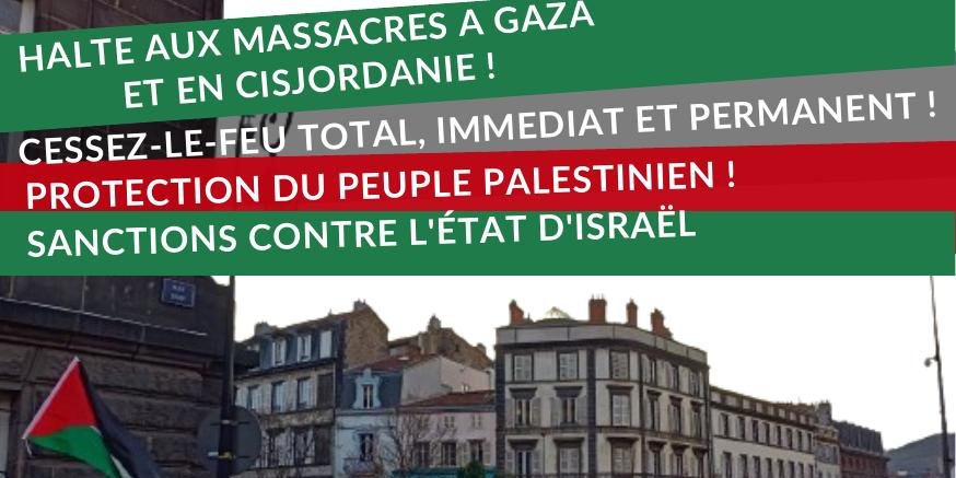 Rassemblement appelé par le Collectif 63 pour une Paix juste et durable (30) : AFPS 63, Amis Huma 63, Amis Temps Cerises, Attac 63, Cimade 63, CGT-UD 63, Collectif Nous aussi-63, Conf Paysanne 63, DAL 63, EELV 63, FPRA, FSU 63, Génération.s 63, Jeunes communistes 63, Jeunes écologistes 63, Jeunes Génération.s 63, LFI 63, Libre Pensée 63, LDH 63, MRAP 63, NPA 63, Nouvelle Donne 63, PCF 63, PG 63, RESF 63, Syndicat Avocats France 63, Solidaires 63, Union Etudiante Auvergne, Urgence Gaza 63, Voix lycéenne 63, 4ACG Auvergne.