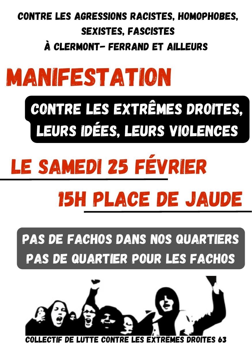 Depuis plusieurs années nous assistons à une importante montée des extrêmes droites partout en France et leurs groupuscules violents pullulent dangereusement dans les rues clermontoises. Depuis maintenant plus d’un an, les attaques sur des militant·e·s, les intimidations, les vols, attaques sur les locaux se multiplient. Pour ne citer qu’un exemple, dans la nuit du 27 au 28 anvier 2023, le local de l’UNEF Auvergne, le syndicat étudiant, a été cambriolé et saccagé, à l’intérieur même de l’Université. Ces groupes violents d’extrêmes droites ne ciblent pas seulement les militant·e·s mais aussi l’ensemble de la population, notamment dans les quartiers, les personnes racisées, les femmes, et les personnes LGBTI. D’ailleurs, ils se revendiquent eux-mêmes comme étant fascistes, et ouvertement racistes, sexistes et homophobes !