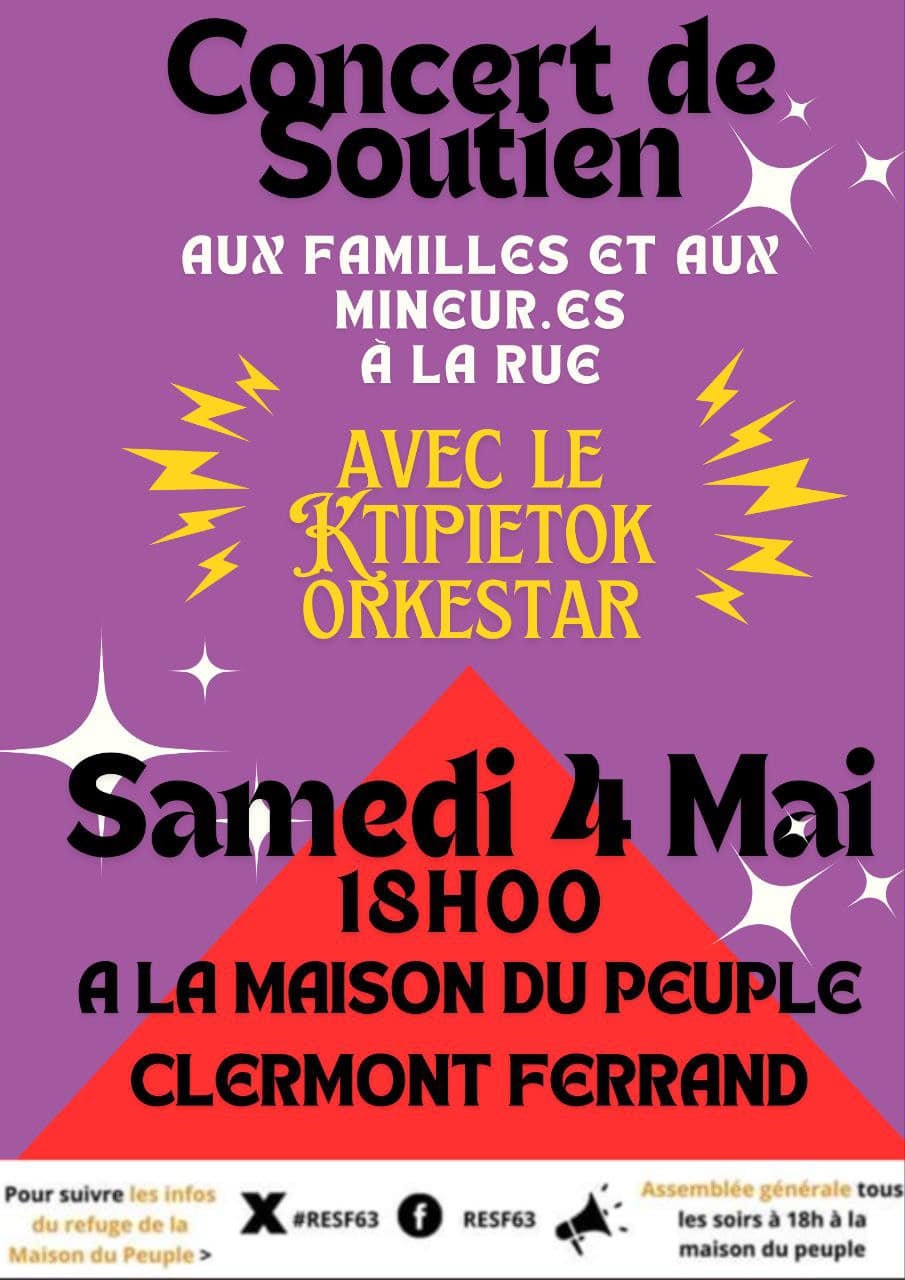 Samedi 4 mai, concert de soutien à 18h à la maison du peuple (cf. affiche ci-jointe).