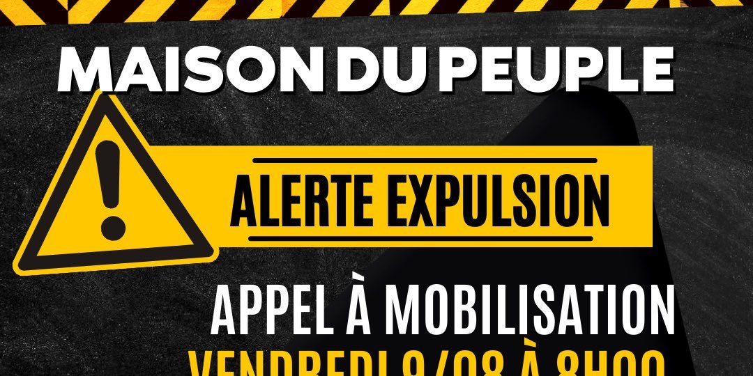 La Mairie prévoit l'expulsion des personnes réfugiées à la Maison du Peuple, abandonnées par la préfecture, mais aussi la ville. Nous venons d'apprendre que l'expulsion serait tenté dès vendredi 9 août, sans préavis et sans solution ! Pas d'expulsions sans relogement ! Soyons nombreux-ses demain dès 8h.