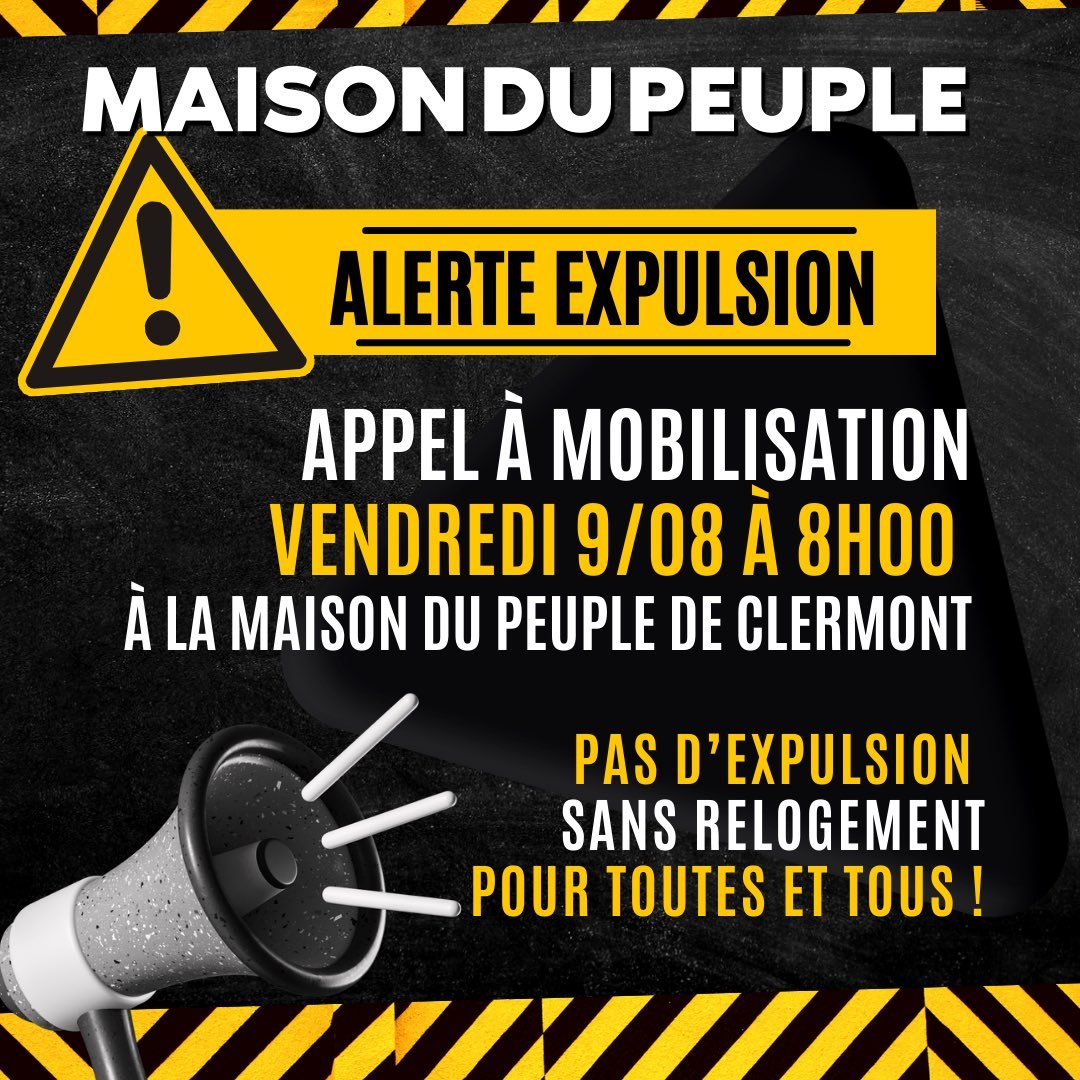Nous apprenons avec stupeur que malgré les discussions, la Mairie de Clermont-Ferrand a décidé d'ordonner l’expulsion des exilé.e.s de la Maison du Peuple le vendredi 09/24 laissant ainsi plusieurs dizaines de personnes dont des enfants à la rue.