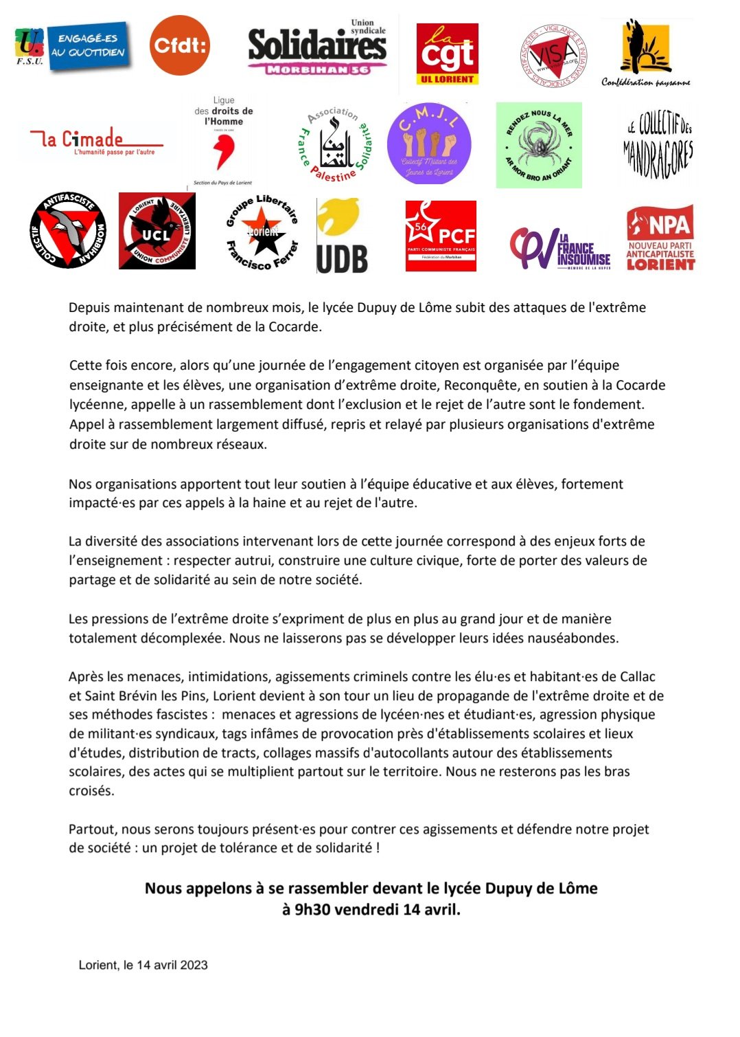 Communiqué inter-orga du Morbihan: Nouvelles menaces d’extrême droite à Lorient
