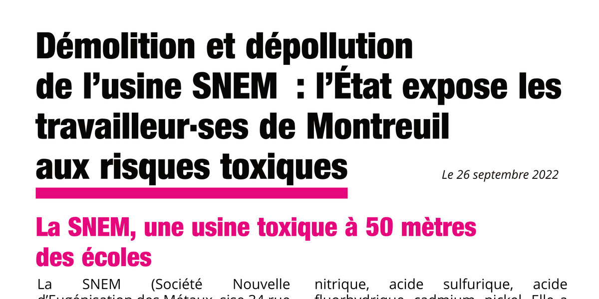 La SNEM (Société Nouvelle d’Eugénisation des Métaux, sise 34 rue des Messiers à Montreuil) était une installation classée à risque pour l’environnement (ICPE) qui a utilisé, pendant plusieurs dizaines d’années et en très grande quantité des substances cancérogènes, mutagènes et reprotoxiques : Chrome 6, acide nitrique, acide sulfurique, acide fluorhydrique, cadmium, nickel. Elle a fermé en 2018 et son terrain a été acquis par l’OPHM (Office HLM de Montreuil).