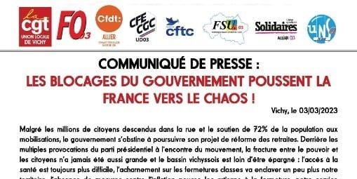 Les journées du 7 mars, du 8 mars et les suivantes seront très puissantes et animées à Vichy. L'intersyndicale a programmé des rassemblements et des actions qui devraient marquer les esprits et donner le tempo pour toutes les autres actions des journées suivantes.