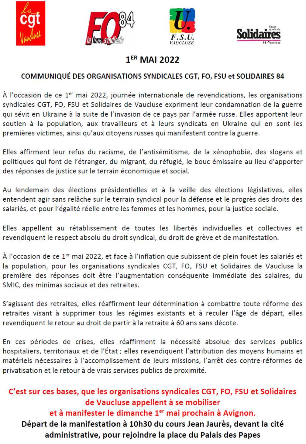 Manif du 1er mai, rendez-vous 10h30 cours Jean Jaurès à Avignon.