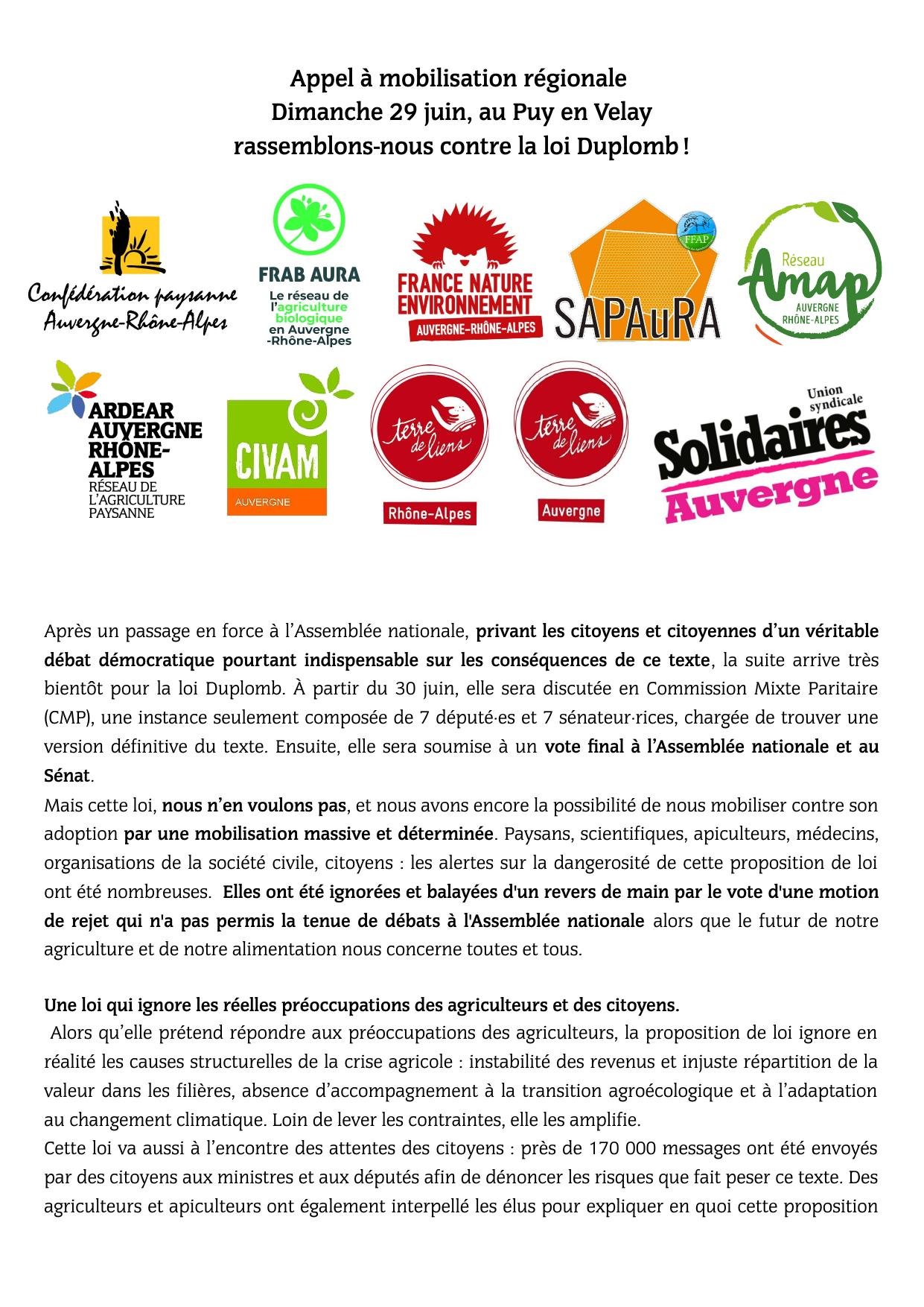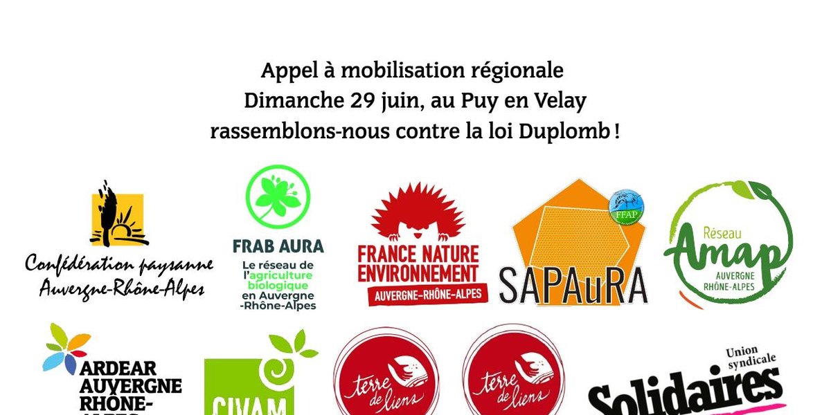 En s’inscrivant dans ce mouvement de mobilisation massive, nous, organisations régionales d’Auvergne-Rhône-Alpes signataires de cet appel, vous invitons à nous rejoindre dimanche 29 juin à 11H au Puy en Velay, devant la Préfecture. Nous marcherons ensemble jusqu’à la permanence du sénateur Duplomb, l’auteur même de cette loi destructive.