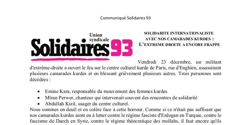 Nous dénonçons enfin la passivité des gouvernements français successifs concernant la sécurité des Kurdes en France. Dix ans après l'assassinat de trois militantes kurdes à Paris, nous adressons toutes nos condoléances, notre soutien et notre camaraderie à la communauté kurde, aux membres du centre culturel de Paris, et en particulier aux familles des victimes. Où qu'il soit, ensemble nous lutterons contre le fascisme.