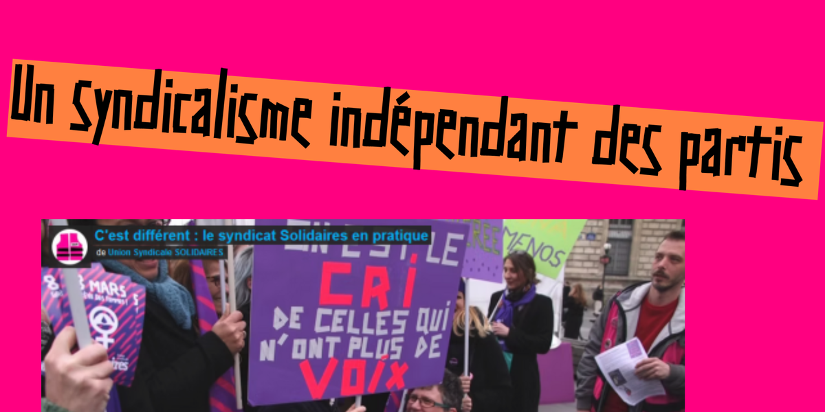 Beaucoup confondent indépendance du syndicalisme par rapport aux partis politiques et apolitisme. En vérité, le fait que Solidaires se réclame d'un syndicalisme de transformation sociale montre bien que ses militant-e-s s'impliquent concrètement dans l'organisation de la cité, et cela procède à l'évidence d'un acte profondément politique et citoyen, cependant très éloigné des pratiques politiciennes dont le but et de conquérir le pouvoir. Le syndicalisme, lui, n'a pas un tel projet. Par contre il vise à redonner la parole à ceux qui ne l'ont pas et élargir le plus possible les prises de décisions qui impactent la vie des gens.