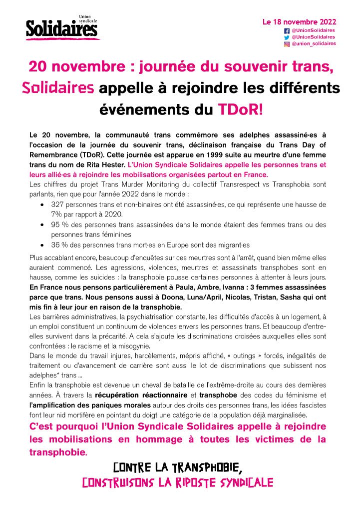 C’est pourquoi l’Union Syndicale Solidaires appelle à rejoindre les mobilisations en hommage à toutes les victimes de la transphobie.