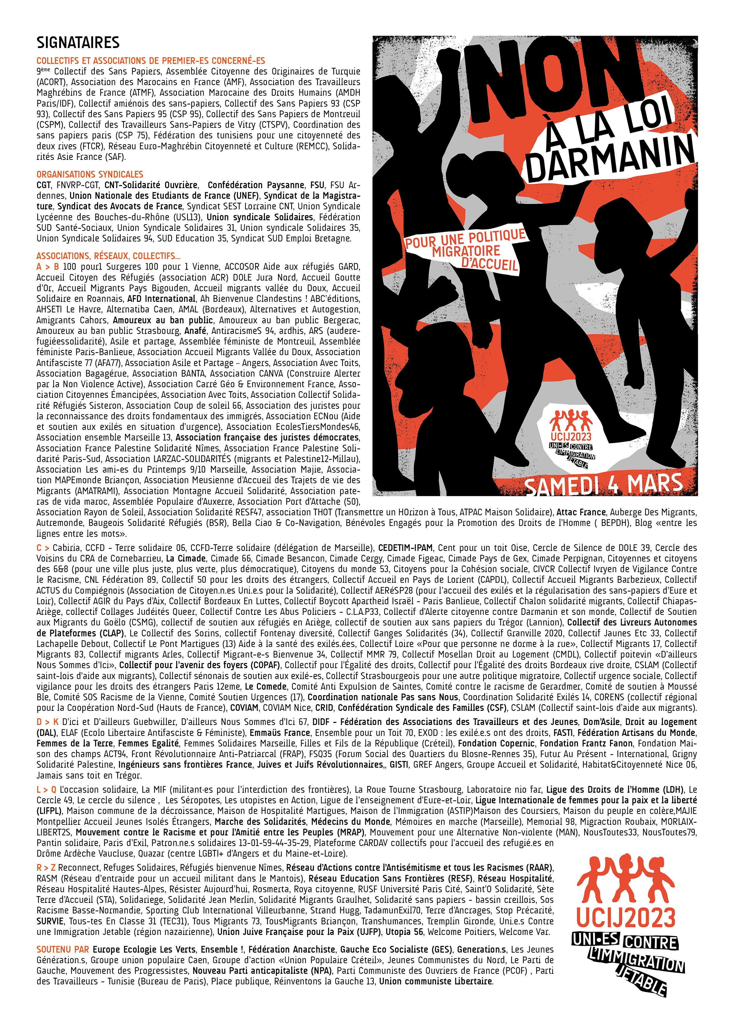 C. Cabiria, CCFD - Terre solidaire 06, CCFD-Terre solidaire (délégation de Marseille), CEDETIM-IPAM, Cent pour un toit Oise, Cercle de Silence de DOLE 39, Cercle des Voisins du CRA de Cornebarrieu, La Cimade, Cimade 66, Cimade Besancon, Cimade Cergy, Cimade Figeac, Cimade Pays de Gex, Cimade Perpignan, Citoyennes et citoyens des 6&8 (pour une ville plus juste, plus verte, plus démocratique), Citoyens du monde 53, Citoyens pour la Cohésion sociale, CIVCR Collectif Ivryen de Vigilance Contre le Racisme, CNL Fédération 89, Collectif 50 pour les droits des étrangers, Collectif Accueil en Pays de Lorient (CAPDL), Collectif Accueil Migrants Barbezieux, Collectif ACTUS du Compiégnois : Association de Citoyen.n.es Uni.e.s pour la Solidarité, Collectif AERéSP28 (pour l'accueil des exilés et la régularisation des sans-papiers d'Eure et Loir), Collectif AGIR du Pays d'Aix, Collectif Bordeaux En Luttes, Collectif Boycott Apartheid Israël - Paris Banlieue, Collectif Chalon solidarité migrants, Collectif Chiapas-Ariège, collectif Collages Judéités Queer, Collectif Contre Les Abus Policiers - C.L.A.P33, Collectif d’Alerte citoyenne contre Darmanin et son monde, Collectif de Soutien aux Migrants du Goëlo (CSMG), collectif de soutien aux réfugiés en Ariège, collectif de soutien aux sans papiers du Trégor (Lannion), Collectif des Livreurs Autonomes de Plateformes (CLAP), Le Collectif des Sorins, collectif Fontenay diversité, Collectif Ganges Solidarités (34), Collectif Granville 2020, Collectif Jaunes Etc 33, Collectif Lachapelle Debout, Collectif Le Pont Martigues (13) Aide à la santé des exilés.ées, Collectif Loire "Pour que personne ne dorme à la rue", Collectif Migrants 17, Collectif Migrants 83, Collectif migrants Arles, Collectif Migrant-e-s Bienvenue 34, Collectif MMR 79, Collectif Mosellan Droit au Logement (CMDL), Collectif poitevin "D'ailleurs Nous Sommes d'Ici", Collectif pour l'avenir des foyers (COPAF), Collectif pour l'Égalité des droits, Collectif pour l'Égalité des droits Bordeaux rive droite, CSLAM (Collectif saint-lois d'aide aux migrants), Collectif sénonais de soutien aux exilé-es, Collectif Strasbourgeois pour une autre politique migratoire, Collectif urgence sociale, Collectif vigilance pour les droits des étrangers Paris 12eme, Le Comede, Comité Anti Expulsion de Saintes, Comité contre le racisme de Gerardmer, Comité de soutien à Moussé Ble, Comité SOS Racisme de la Vienne, Comité Soutien Urgences (17), Coordination nationale Pas sans Nous, Coordination Solidarité Exilés 14, CORENS (collectif régional pour la Coopération Nord-Sud (Hauts de France), COVIAM, COVIAM Nice, CRID, Confédération Syndicale des Familles (CSF), CSLAM (Collectif saint-lois d'aide aux migrants).