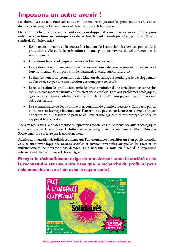 Dans l’immédiat, nous devons renforcer, développer et créer des services publics pour anticiper et réduire les conséquences du réchauffement climatique. C’est pourquoi l’Union syndicale Solidaires exige :