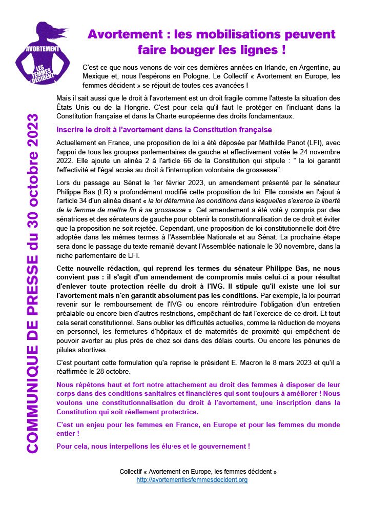 Actuellement en France, une proposition de loi a été déposée par Mathilde Panot (LFI), avec l'appui de tous les groupes parlementaires de gauche et effectivement votée le 24 novembre 2022. Elle ajoute un alinéa 2 à l'article 66 de la Constitution qui stipule : " la loi garantit l'effectivité et l'égal accès au droit à l'interruption volontaire de grossesse".
