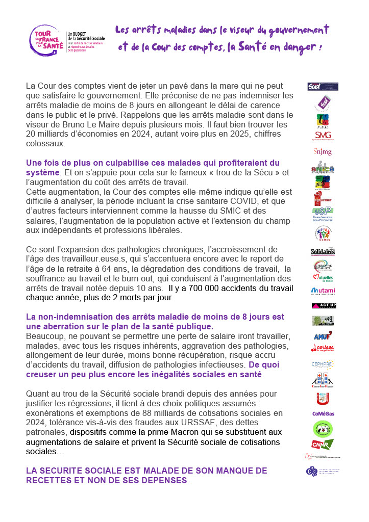 Les organisations parties prenantes du Tour de France pour la santé et les organisations signataires appellent à une mobilisation citoyenne contre ces mesures, et pour la Sécurité sociale et sa réappropriation par les usager.ère.s et assuré.e.s sociaux.