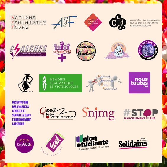 Collectif Emma Auclert, Stop VOG, Collectif National des Droits des Femmes, Nous Toutes, Union étudiante, Sud Santé Sociaux, Union syndicale Solidaires, Osez le Féminisme, SNJMG, MIOP, AneF, CLASCHES, Pour une santé engagée et solidaire, Observatoire des violences sexistes et sexuelles dans l’enseignement supérieur, Association Mémoire Traumatique et Victimologie, Stop Harcèlement de rue, Les Effronté-es, Coordination des Associations pour le Droit à l’Avortement et à la Contraception, Ligue des Femmes Iraniennes pour la Démocratie, Héro.ïnes 95, Les Fallopes, CQFD, CLIT, Les Affolées de la Frange, Action Féministe Tours, Réseau féministe Ruptures, Les Effrontées, Attac, Femmes avec…, Un maillon manquant, Mouv’enfants