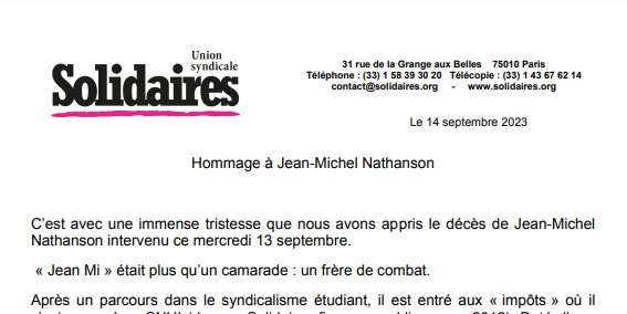 L’Union syndicale Solidaires perd un militant rare et un ami tout aussi rare et adresse son amitié et son soutien à son fils Alexis, à sa famille, ses proches et ses camarades.