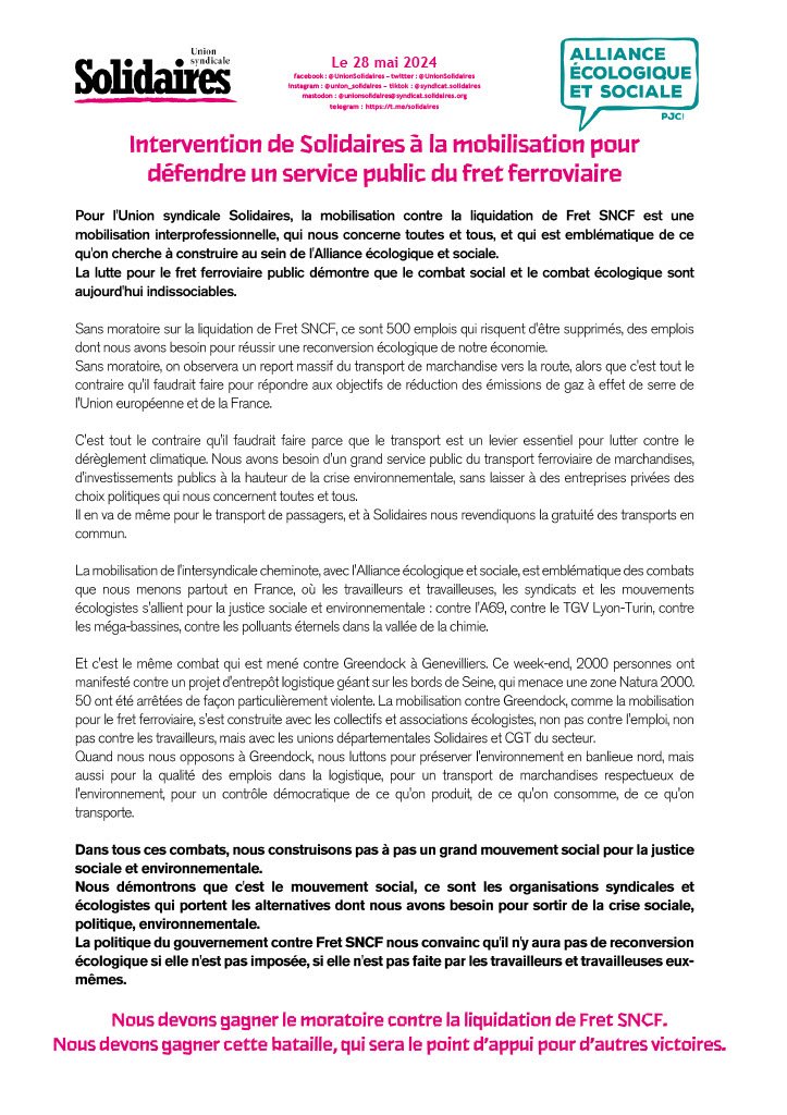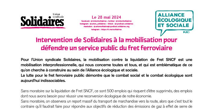 Pour l'Union syndicale Solidaires, la mobilisation contre la liquidation de Fret SNCF est une mobilisation interprofessionnelle, qui nous concerne toutes et tous, et qui est emblématique de ce qu'on cherche à construire au sein de l'Alliance écologique et sociale.