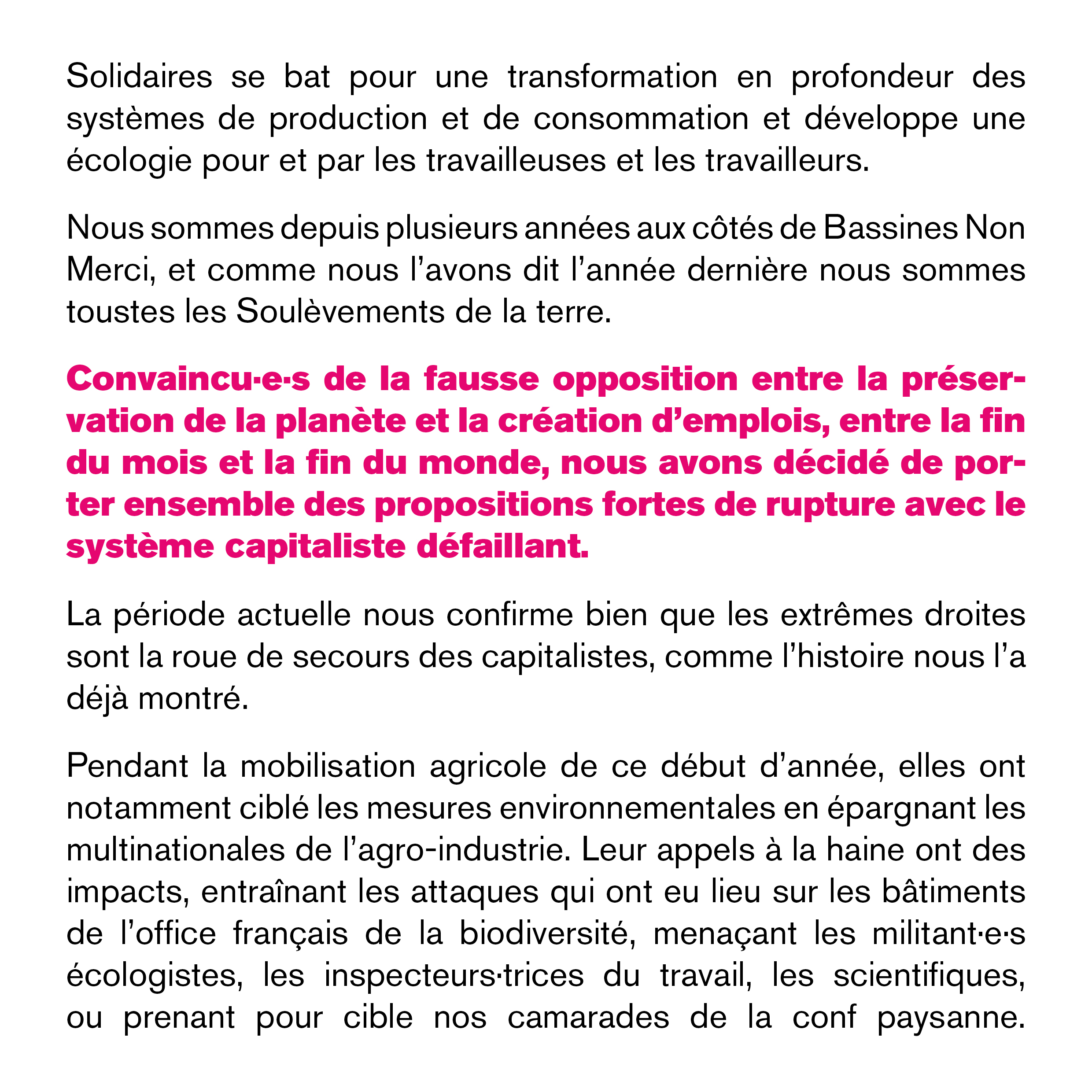 Solidaires se bat pour une transformation en profondeur des systèmes de production et de consommation et développe une écologie pour et par les travailleuses et les travailleurs.