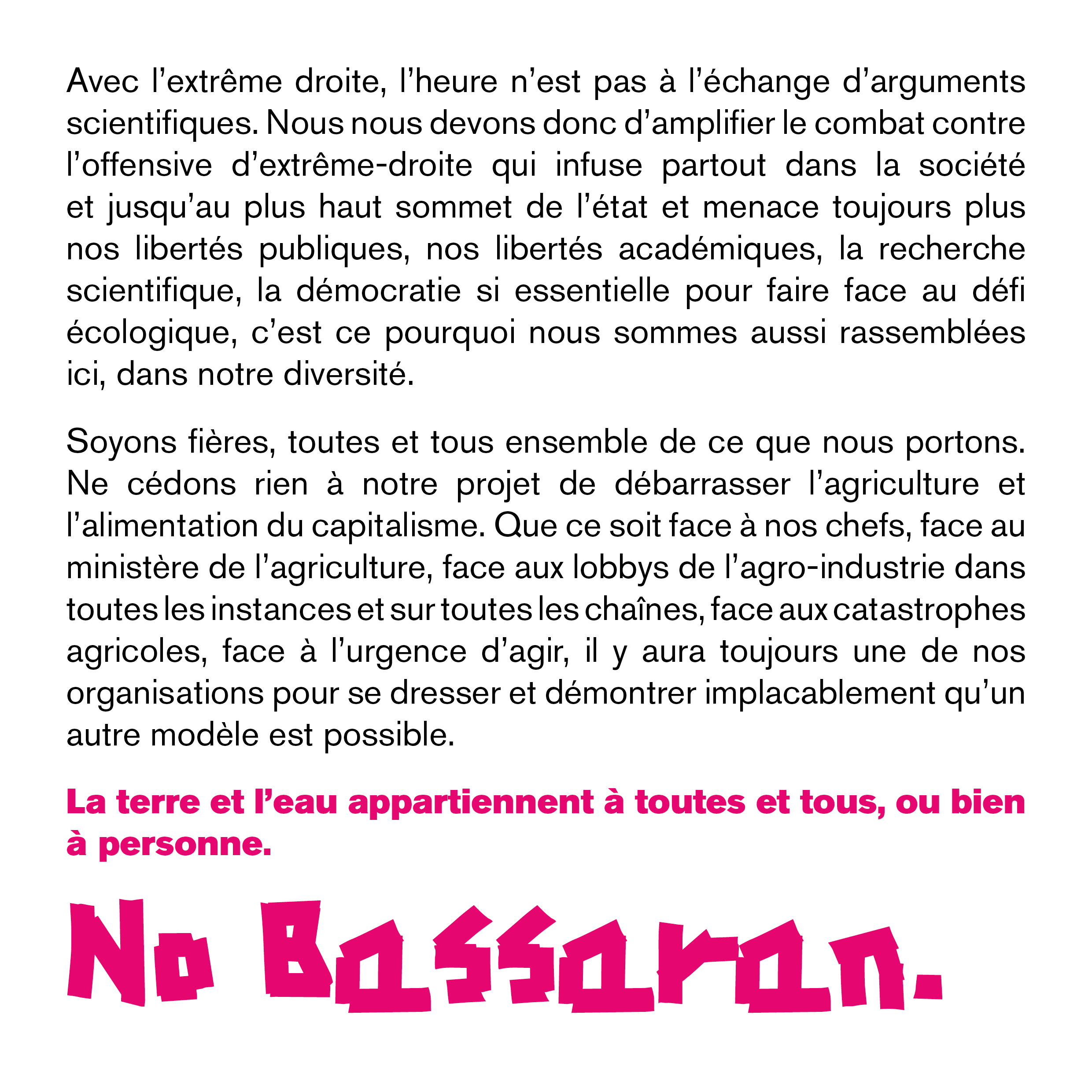 Soyons fières, toutes et tous ensemble de ce que nous portons. Ne cédons rien à notre projet de débarrasser l’agriculture et l’alimentation du capitalisme. Que ce soit face à nos chefs, face au ministère de l’agriculture, face aux lobbys de l’agro-industrie dans toutes les instances et sur toutes les chaînes, face aux catastrophes agricoles, face à l’urgence d’agir, il y aura toujours une de nos organisations pour se dresser et démontrer implacablement qu’un autre modèle est possible.