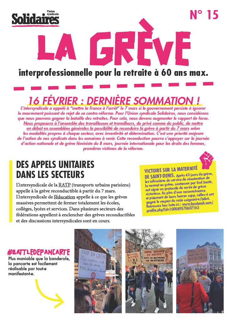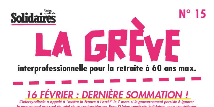 L’intersyndicale a appelé à “mettre la France à l’arrêt” le 7 mars si le gouvernement persiste à ignorer le mouvement puissant de rejet de sa contre-réforme. Pour l’Union syndicale Solidaires, nous considérons que nous pouvons gagner la bataille des retraites. Pour cela, nous devons augmenter le rapport de force. Nous proposons à l’ensemble des travailleuses et travailleurs, du privé comme du public, de mettre en débat en assemblées générales la possibilité de reconduire la grève à partir du 7 mars selon les modalités propres à chaque secteur, avec inventivité et détermination. C’est une priorité majeure de l’action de nos syndicats dans les semaines à venir. Cette reconduction pourra s’appuyer sur la journée d’action nationale et de grève féministe du 8 mars, journée internationale pour les droits des femmes, premières victimes de la réforme.