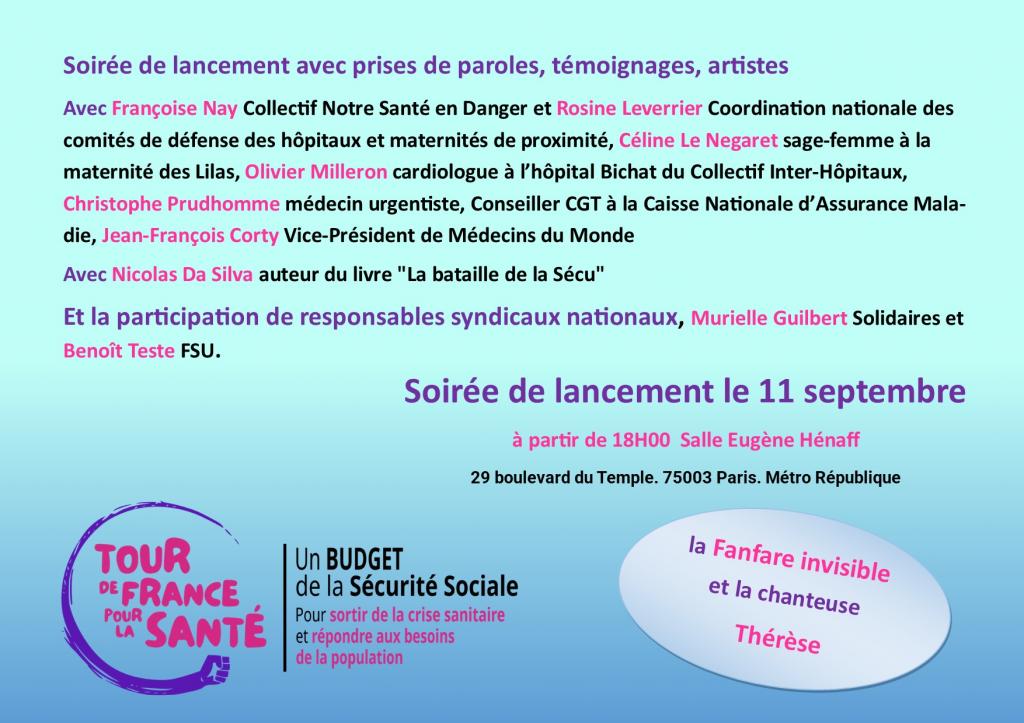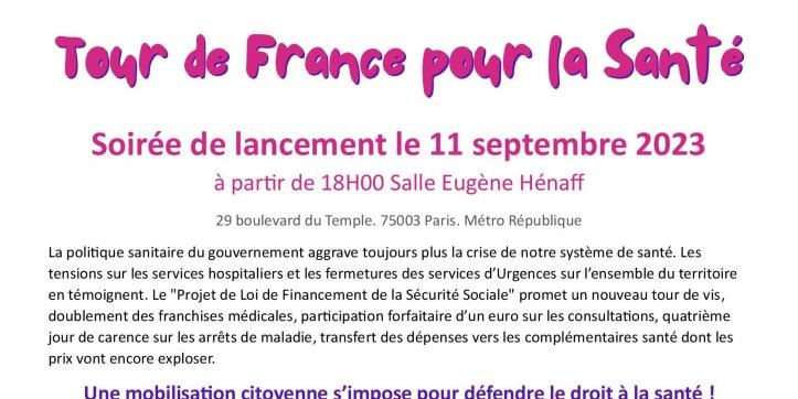 Plus d’une cinquantaine d’organisations et de collectifs se mobilise pour l’accès aux soins pour toutes et tous, pour l’obtention d’un budget de la Sécurité Sociale pour sortir de la crise sanitaire et répondre aux besoins des populations. Ils s’engagent dans la construction d'un « Tour de France pour la Santé ».