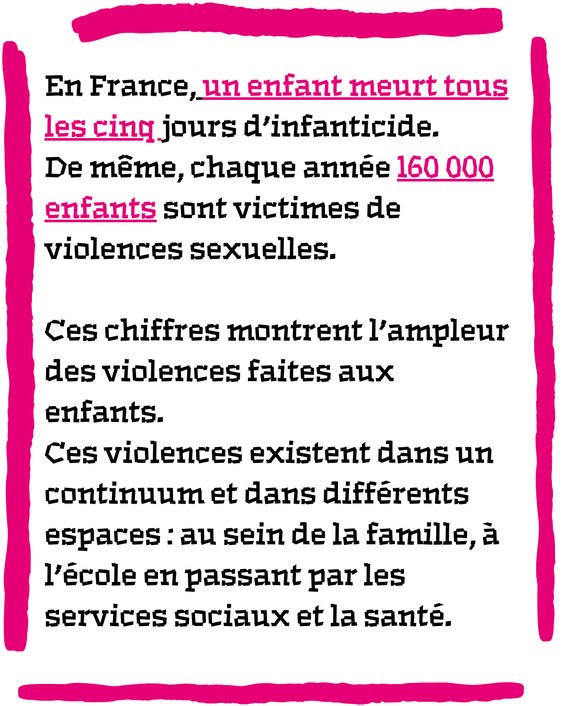 La défense des droits des enfants est un enjeu collectif car elles et ils sont violenté·es dans nos espaces privés mais aussi sur nos lieux de travail. Iels peuvent aussi subir des violences que ce soit en tant qu’usager·ères, patient·es mais aussi lors des premières expériences dans le milieu professionnel.
