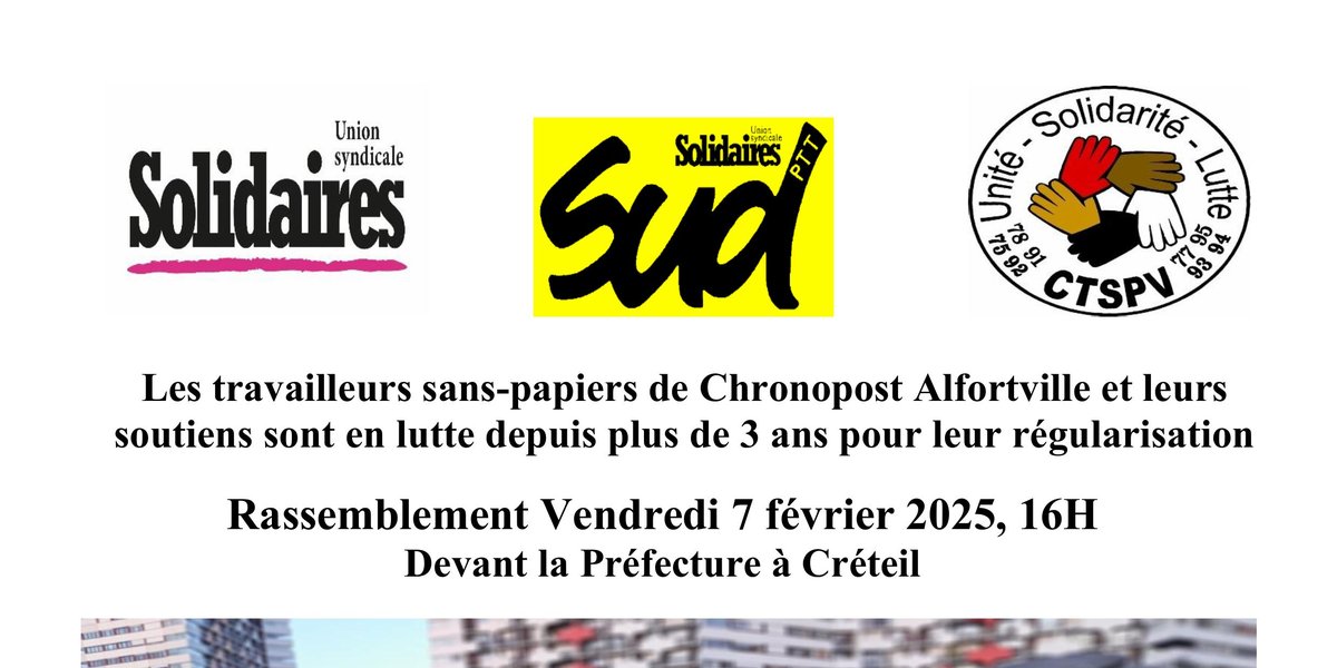 Les travailleurs sans-papiers de Chronopost Alfortville et leurs soutiens sont en lutte depuis plus de 3 ans pour leur régularisation Rassemblement Vendredi 7 février 2025, 16H Devant la Préfecture à Créteil