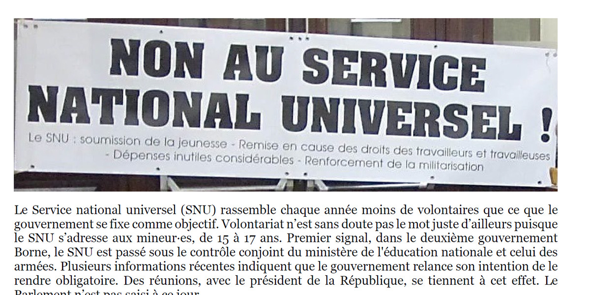 Un communiqué du collectif Non au SNU, dont l'Union syndicale Solidaires et plus organisations membres font partie, à propos du projet de rendre obligatoire le Service national universel pour les jeunes de 15 à 17 ans.