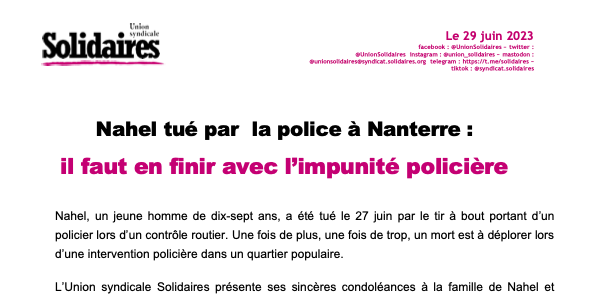 L’Union syndicale Solidaires se joint à l’appel à marcher ce jeudi 29 juin, à 14h à Nanterre pour soutenir la famille.