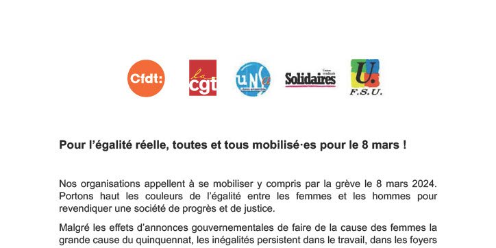 Nos organisations (CFDT, CGT, FSU, Solidaires, UNSA) appellent à se mobiliser y compris par la grève le 8 mars 2024.