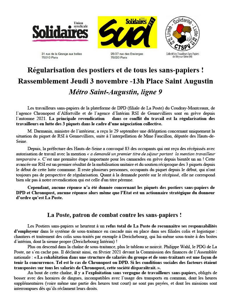 Les travailleurs sans-papiers de la plateforme de DPD (filiale de La Poste) du Coudray-Montceaux, de l’agence Chronopost d’Alfortville et de l’agence d’Intérim RSI de Gennevilliers sont en grève depuis l’automne 2021. La principale revendication dans ce conflit du travail est la régularisation des travailleurs en lutte des 3 piquets dans le cadre d’une négociation collective.