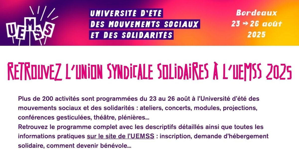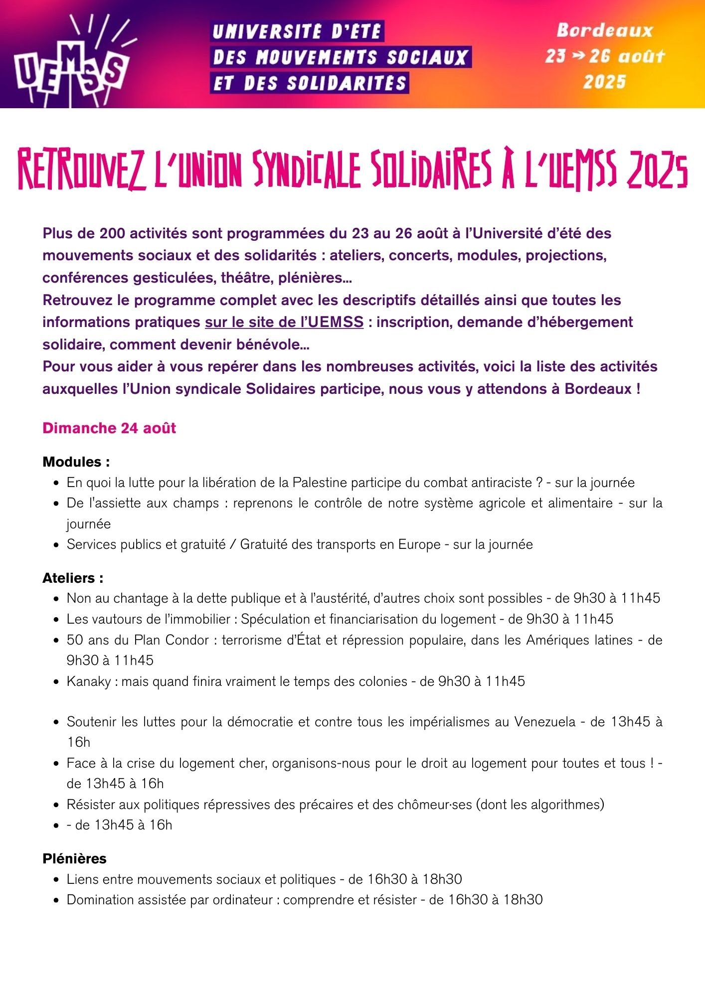 Pour vous aider à vous repérer dans les nombreuses activités, voici la liste des activités auxquelles l’Union syndicale Solidaires participe, nous vous y attendons à Bordeaux !