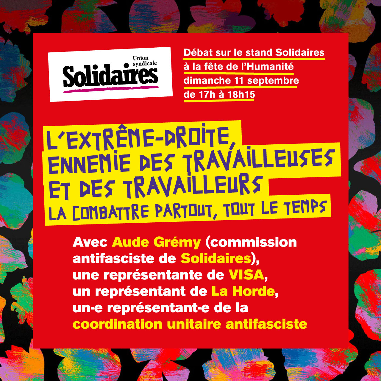 Avec : Aude Grémy (commission antifasciste de Solidaires), une représentante de VISA, un représentant de La Horde, un.e représentant.e de la coordination unitaire antifasciste