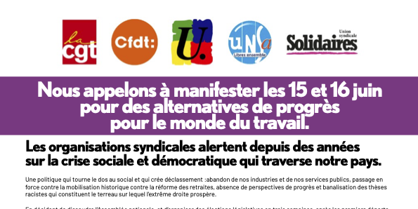 Tract intersyndical : Nous appelons à manifester les 15 et 16 juin pour des alternatives de progrès pour le monde du travail à adapter avec vos dates de mobilisations.