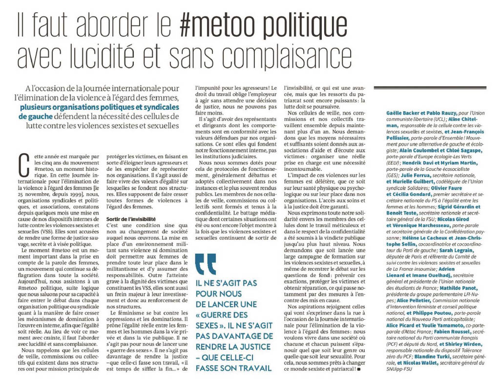 Tribune Inter-Organisations à l’occasion du 25 novembre 2022 : Journée internationale de lutte contre les violences à l’égard des femmes - parue dans Le Monde le 25 novembre https://www.lemonde.fr/idees/article/2022/11/25/il-faut-aborder-le-metoo-politique-avec-lucidite-et-sans-complaisance_6151587_3232.html