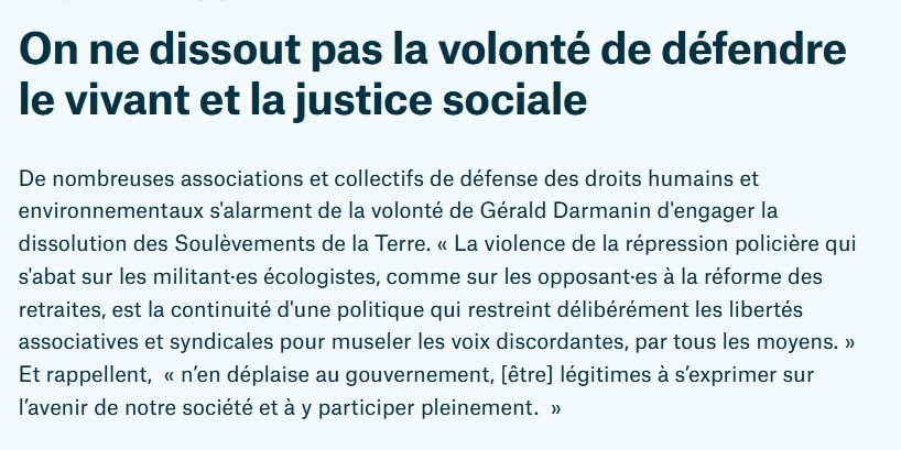 De nombreuses associations et collectifs de défense des droits humains et environnementaux s'alarment de la volonté de Gérald Darmanin d'engager la dissolution des Soulèvements de la Terre. « La violence de la répression policière qui s'abat sur les militant·es écologistes, comme sur les opposant·es à la réforme des retraites, est la continuité d'une politique qui restreint délibérément les libertés associatives et syndicales pour museler les voix discordantes, par tous les moyens. » Et rappellent, « n’en déplaise au gouvernement, [être] légitimes à s’exprimer sur l’avenir de notre société et à y participer pleinement. »