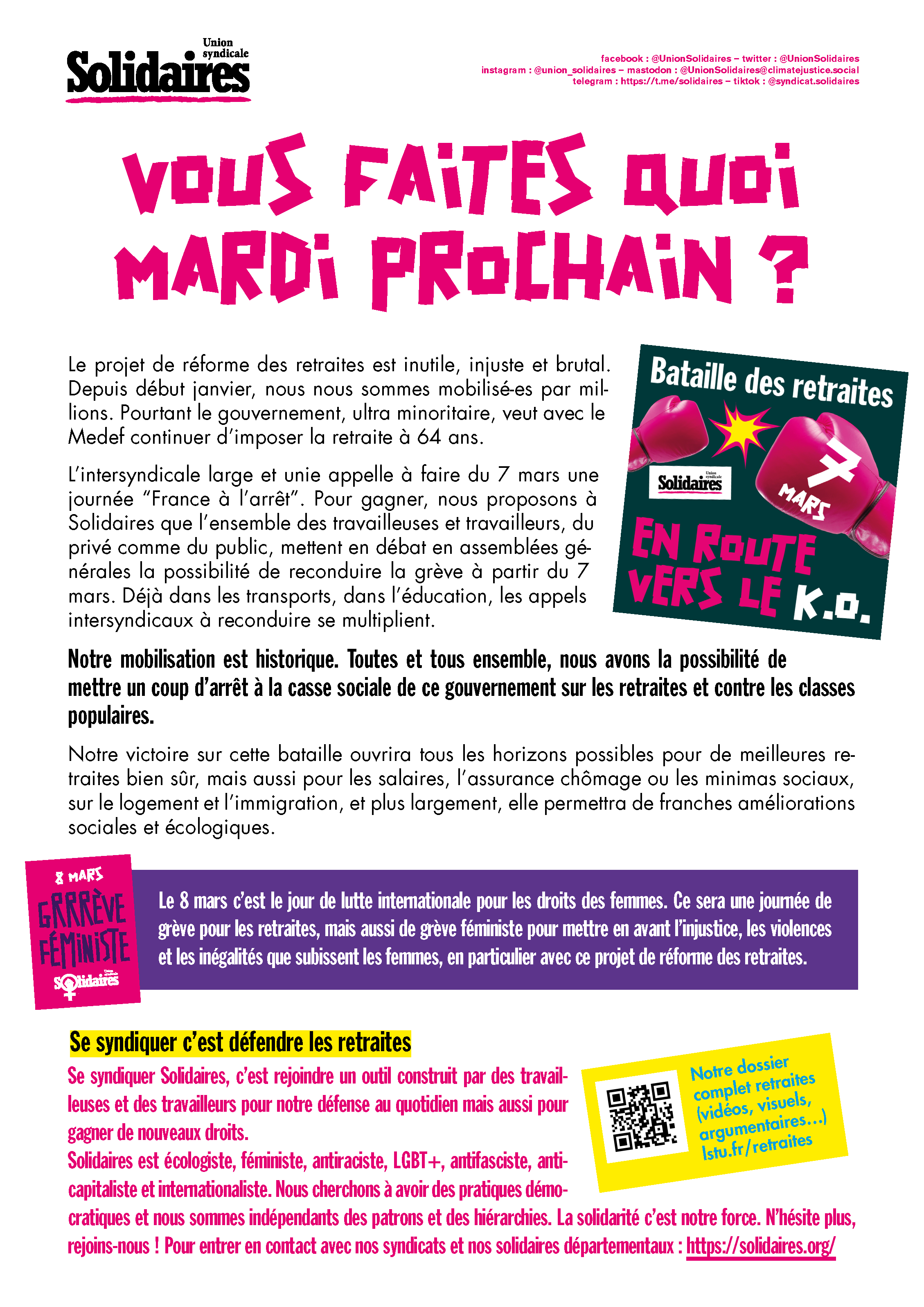 L’intersyndicale large et unie appelle à faire du 7 mars une journée “France à l’arrêt”. Pour gagner, nous proposons à Solidaires que l’ensemble des travailleuses et travailleurs, du privé comme du public, mettent en débat en assemblées générales la possibilité de reconduire la grève à partir du 7 mars. Déjà dans les transports, dans l’éducation, les appels intersyndicaux à reconduire se multiplient.