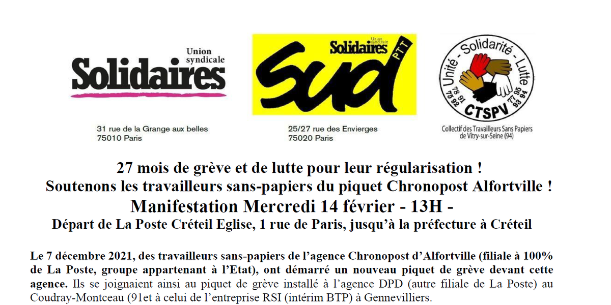 La prochaine manifestation du piquet Chronopost Alfortville aura lieu mercredi 14 février 2024, à partir de 13H de La Poste Créteil Eglise, 1 rue de Paris, jusqu'à la préfecture à Créteil .