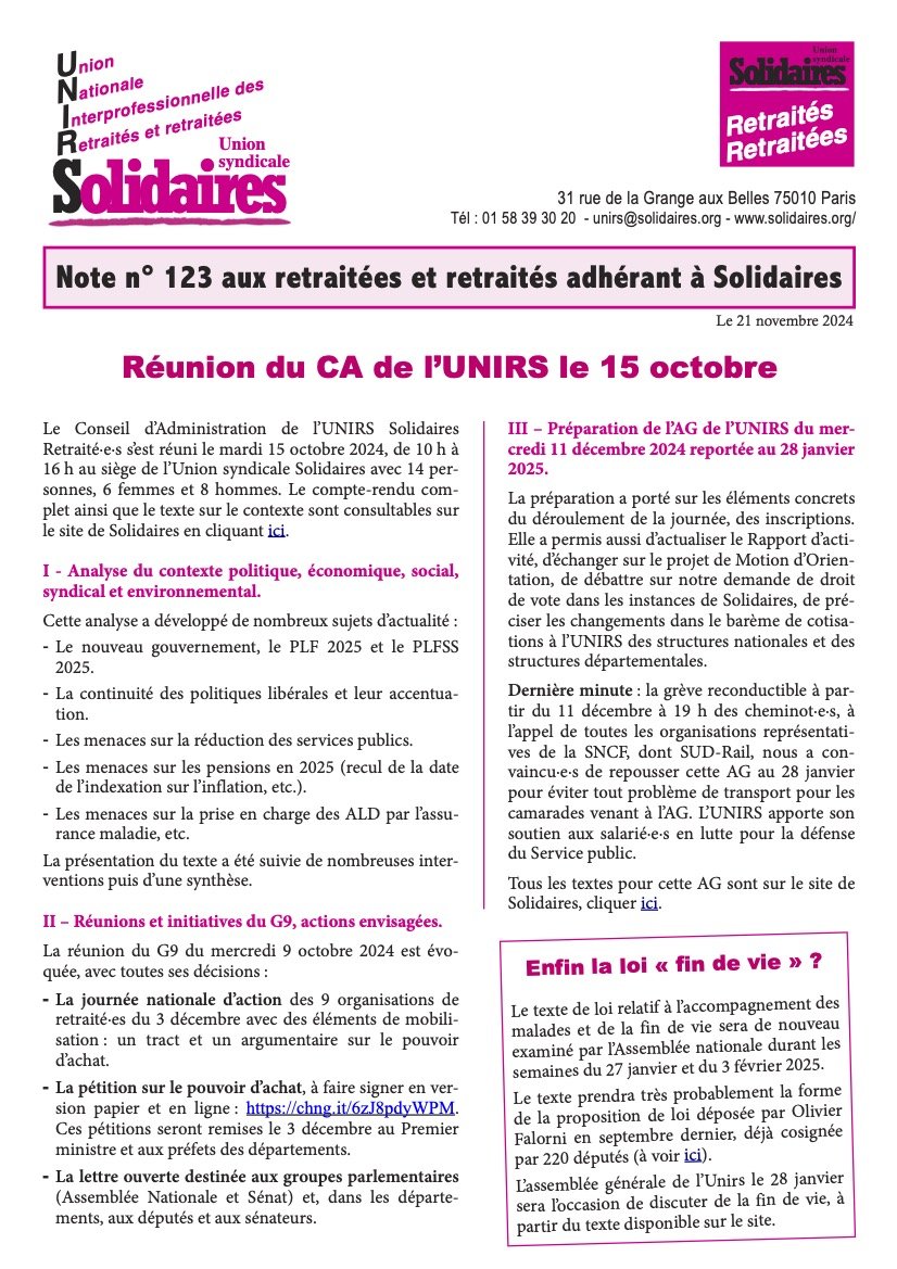 - La journée nationale d’action des 9 organisations de retraité·es du 3 décembre avec des éléments de mobilisation : un tract et un argumentaire sur le pouvoir d’achat.