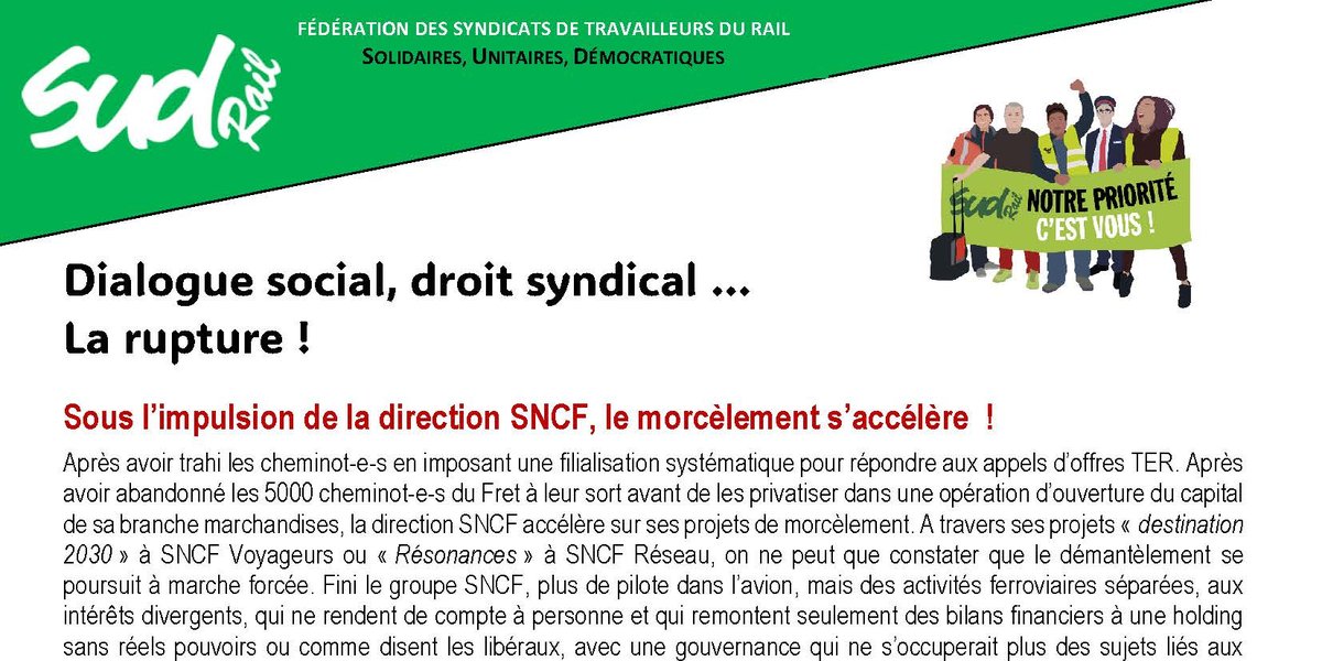 loyales sur la base du besoin et des intérêts des cheminot-e-s, SUD-Rail, réuni en conseil fédéral, a décidé d’acter la rupture complète du dialogue social avec la direction SNCF.