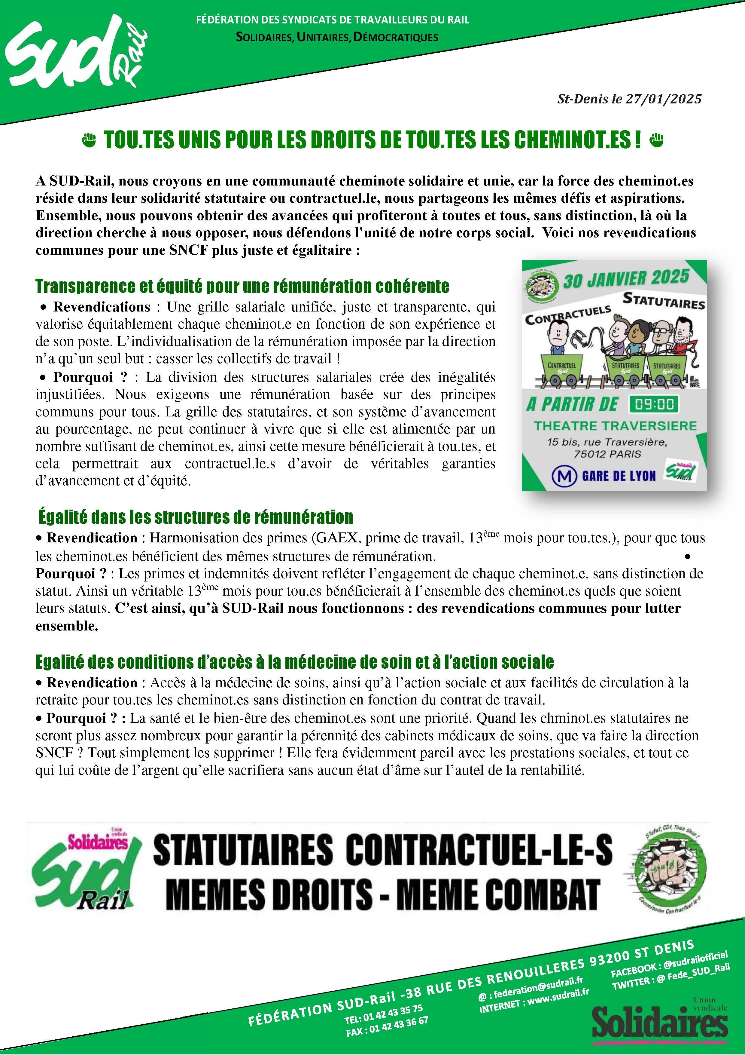 A SUD-Rail, nous croyons en une communauté cheminote solidaire et unie, car la force des cheminot.es réside dans leur solidarité statutaire ou contractuel.le, nous partageons les mêmes défis et aspirations.
