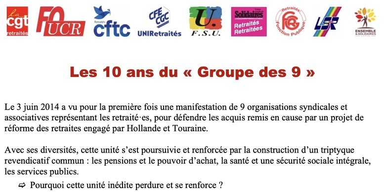 Voici les décisions du Groupe des 9 organisations de retraité·es, notamment la préparation de l'anniversaire des 10 ans avec l'historien politologue Jean-Michel Pernot.